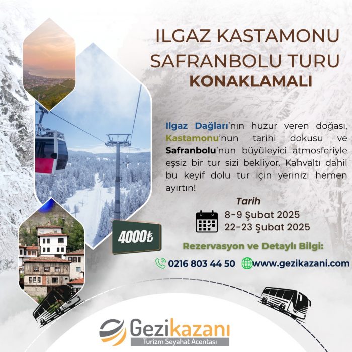 Siz değerli misafirlerimizi belirtilen noktalardan aldıktan sonra ,yolculuğumuza başlıyoruz.Sabah saatlerinde yolda vereceğimiz kahvaltı sonrası(ekstra) ılgaz milli parkına doğru yol alıyoruz.Dört mevsim ayrı bir güzelliğe sahip olan kış aylarında kayak yapmak istiyenlerin ve oksijeni bol olması nedeniyle çam ağaçları arasında yürüyüş yapmak isteyenlerin uğrak noktasında keyifli vakit geçiriyoruz.Hava sartlarının elverdiği süre burada kaldıktan sonra akşam saatlerinde Kastamonu’da olan konağımıza yerleşiyoruz.Geceleme otelimizde.